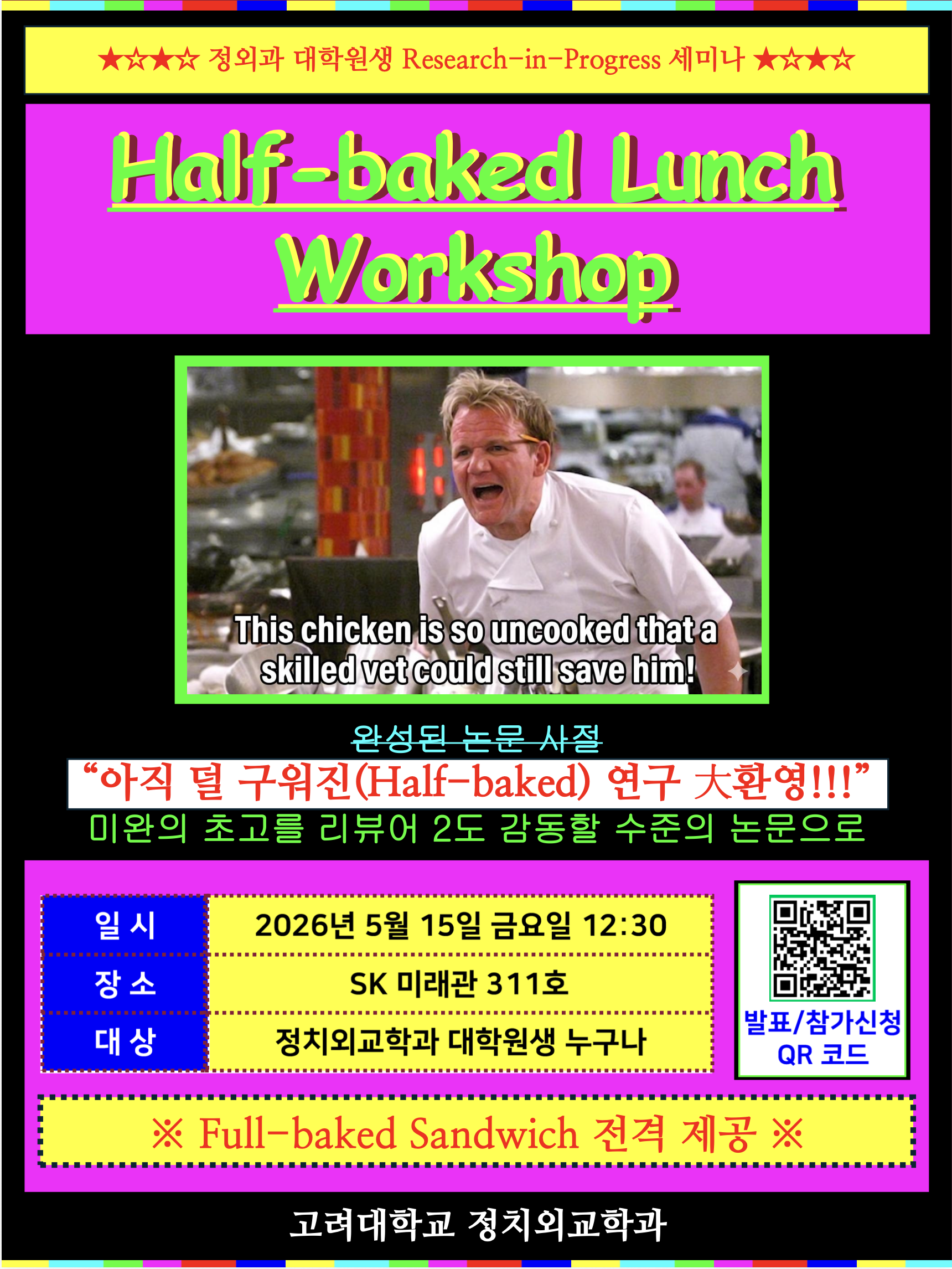 이번 학기부터 우리 정치외교학과에서 ‘Half-baked Lunch Workshop’을 새롭게 시작하고자 합니다. 이름 그대로, 아직 설익은(?) 연구를 들고 와서 full-baked sandwich를 먹으며 교수님과 대학원 동료들과 이야기를 나누는 자리입니다.